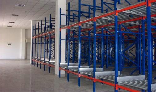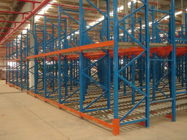 重力式貨架又叫輥道式貨架,屬于倉儲(chǔ)貨架中的托盤類存儲(chǔ)貨架。重力式貨架是橫梁式貨架衍生品之一,貨架結(jié)構(gòu)與橫梁式貨架相似,只是在橫梁上安上滾筒式軌道,軌道呈3-5°傾斜。托盤貨物用叉車搬運(yùn)至貨架進(jìn)貨口,利用自重,托盤從進(jìn)口自動(dòng)滑行至另一端的取貨口。重力式貨架屬于先進(jìn)先出的存儲(chǔ)方式。
